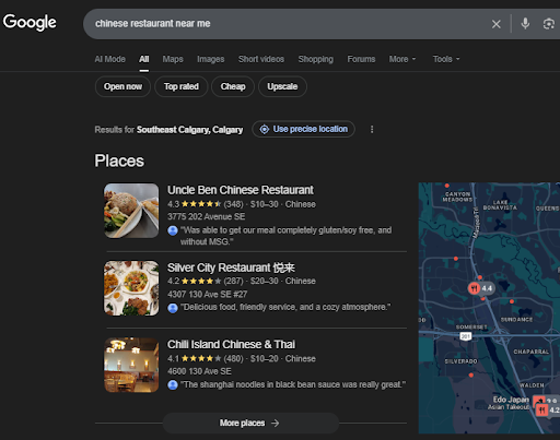 - Use local keywords on your website and blog, such as “Chinese restaurant in Calgary” or “vegan pizza near me.”