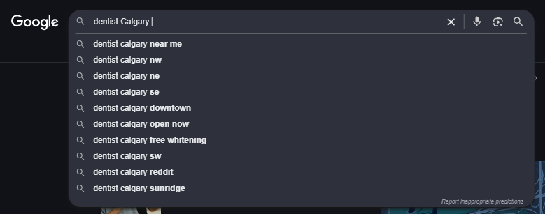 - Typing “dentist Calgary” may show suggestions like: