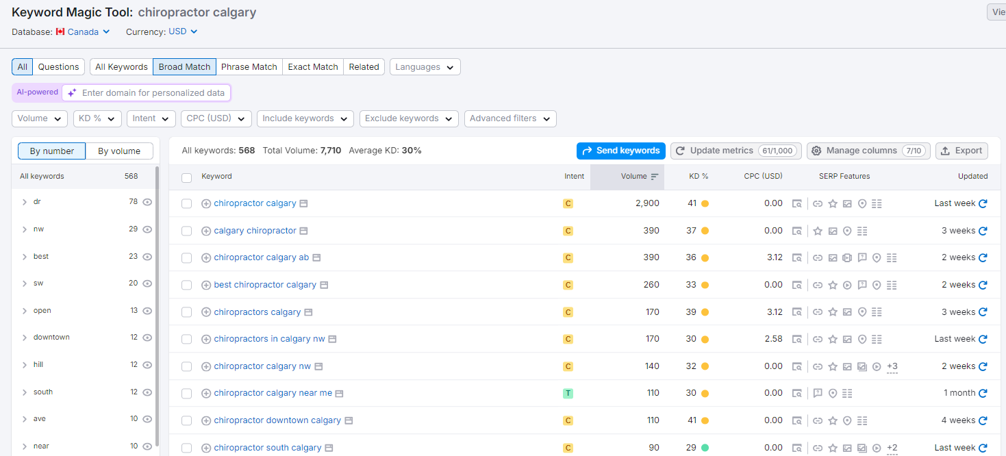 - Type in a seed keyword like “Calgary roofing” or “chiropractor Calgary.”