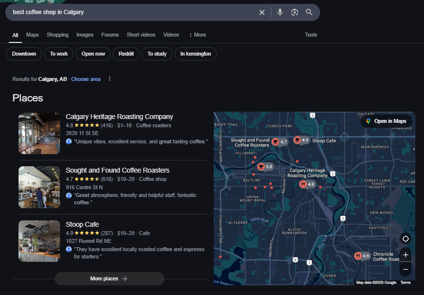 For example, if someone types in “best coffee shop in Calgary,” they’ll likely see a map, star ratings, business hours, and a few options right at the top. This section is incredibly valuable; it captures attention fast and drives calls,
